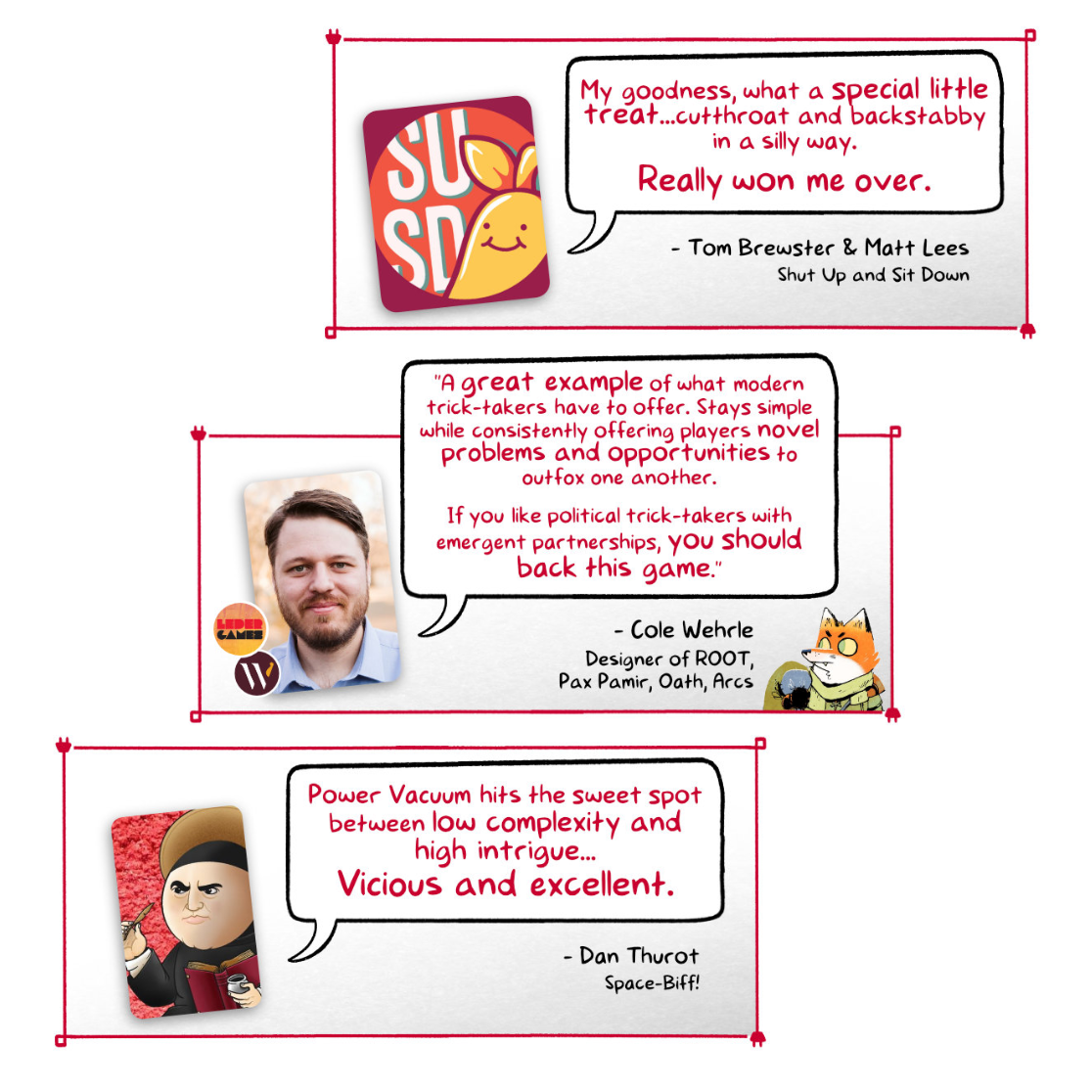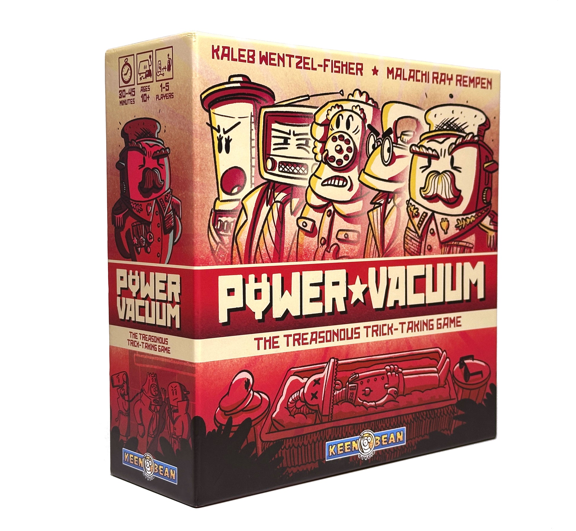 Power Vacuum is a 1-5 player trick-taking game with some treacherous twists. Win tricks to gain Power, but lose tricks to manipulate the Control Board to work toward your hidden Agenda, pulling the strings to ensure one appliance has the most and one has the least Power at the end of the round. Power is used to build pieces of a mighty statue to your own greatness. The first player to complete their statue becomes the next Supreme Appliance!