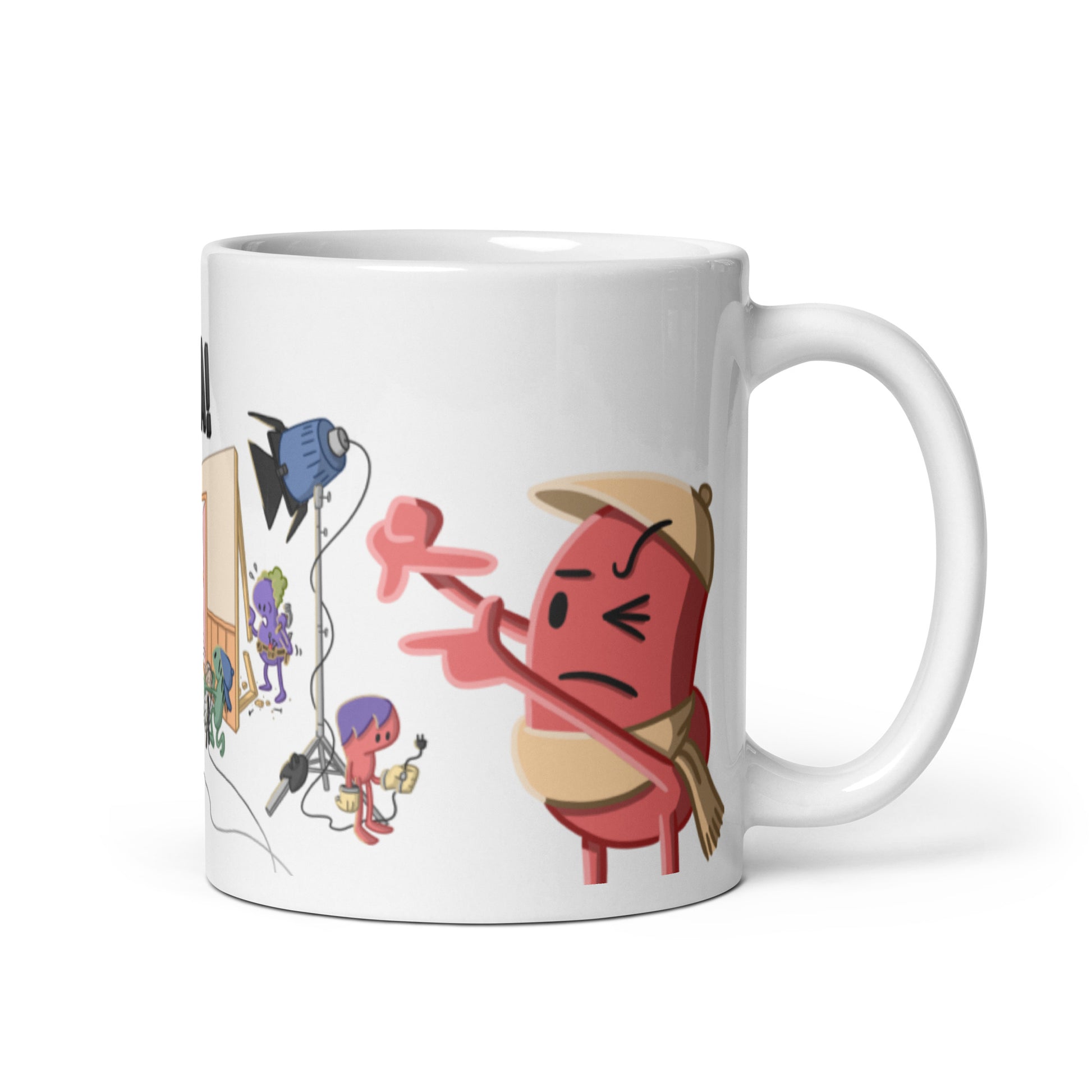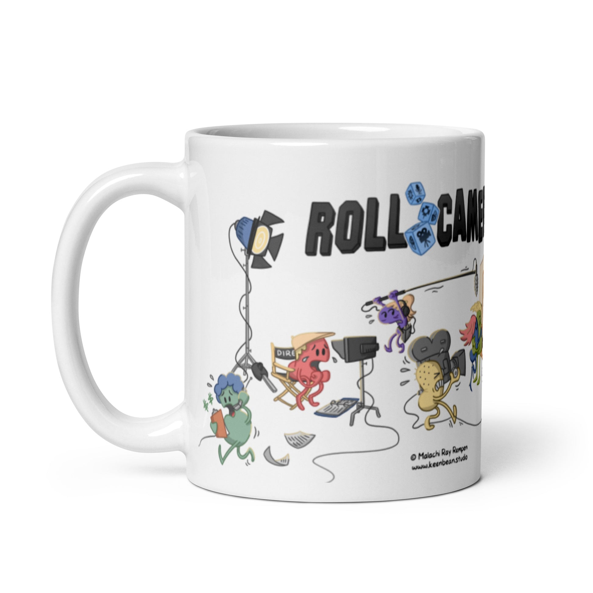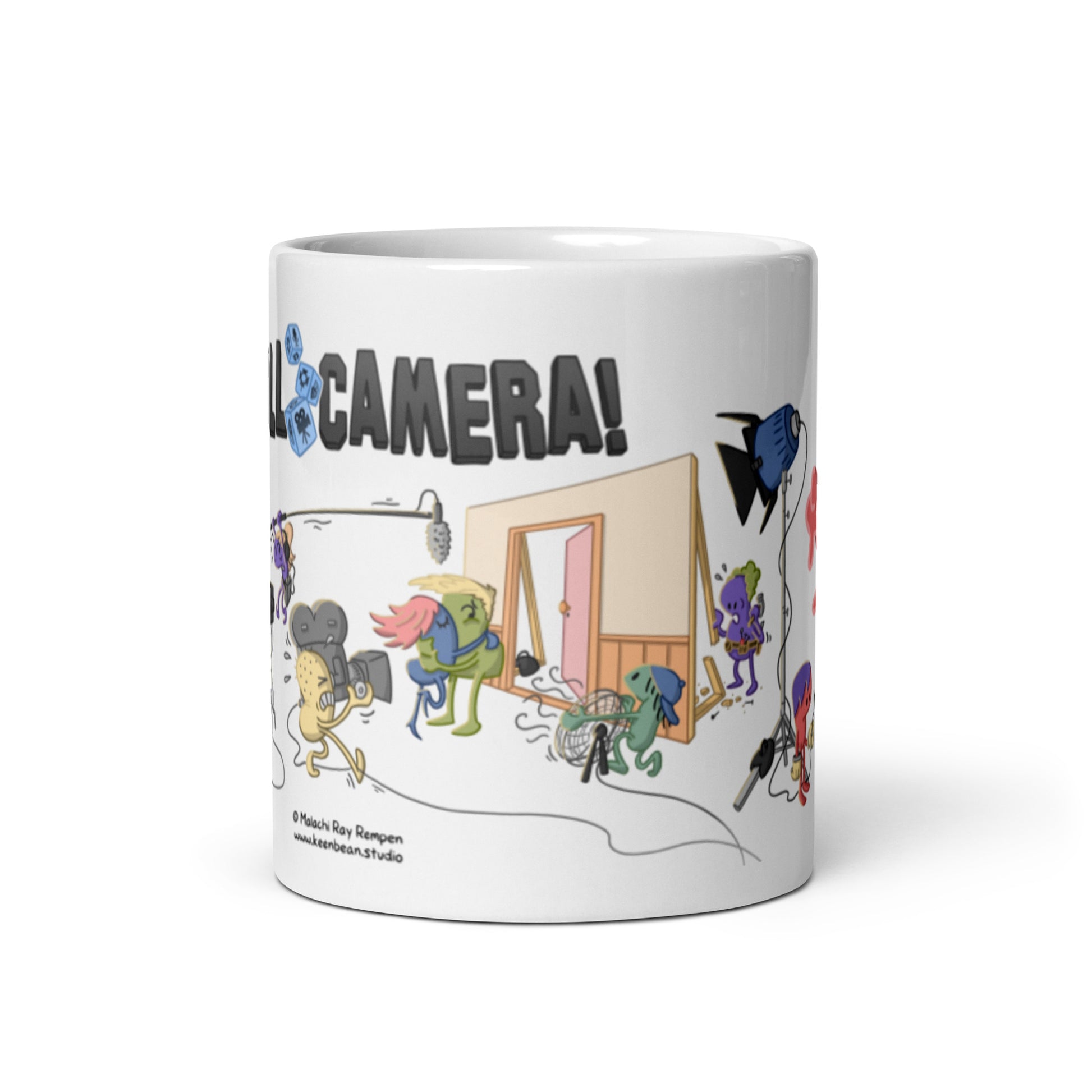 Sip your favorite beverage while pondering the camera placement for your next shot setup with this Roll Camera mug!
