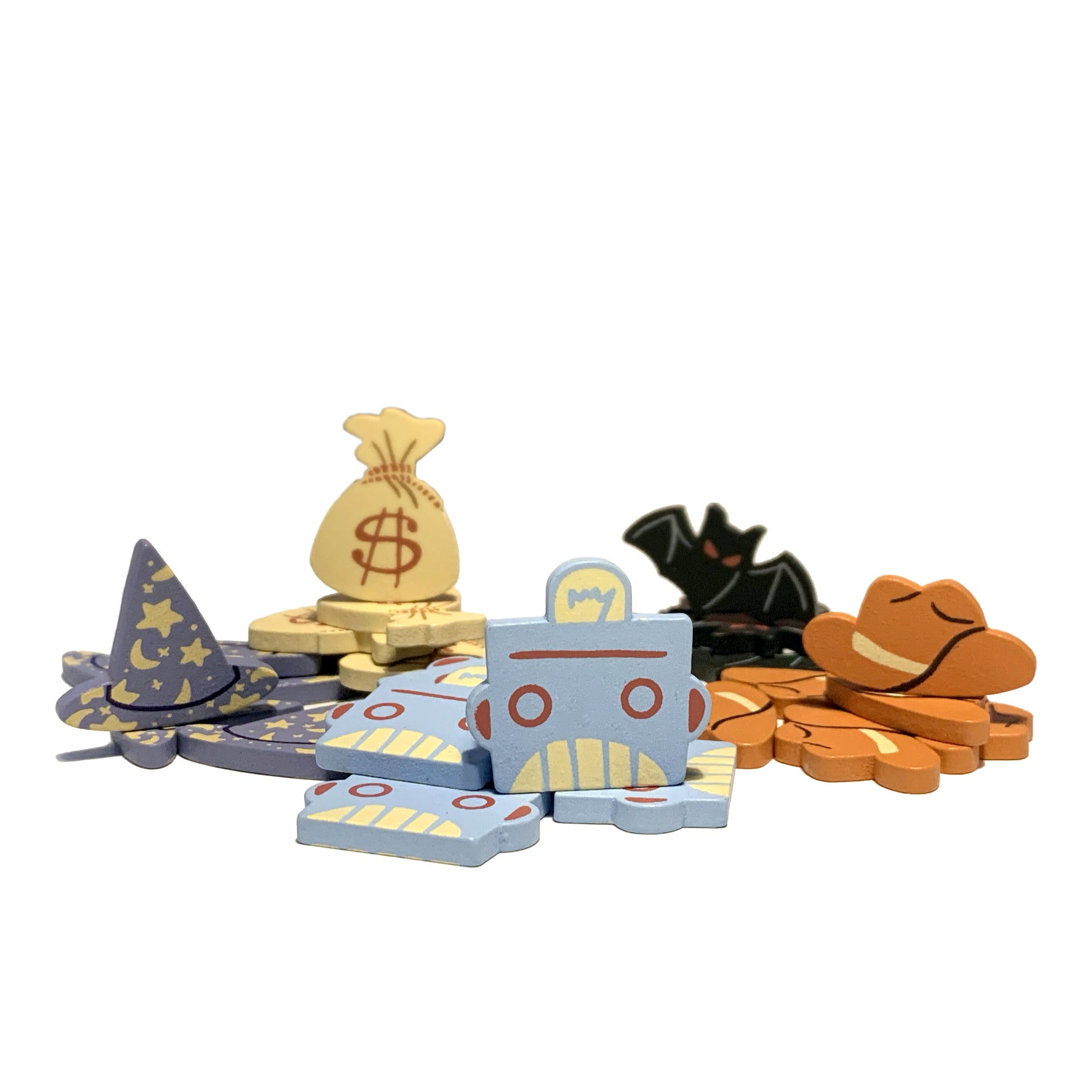 Deluxify your B-Movie Expansion with 30x premium screen-printed wooden cowboy hats, robot heads, bats, money bags and wizard hats! Replaces the cardboard ones that come by default in the B-Movie Expansion.