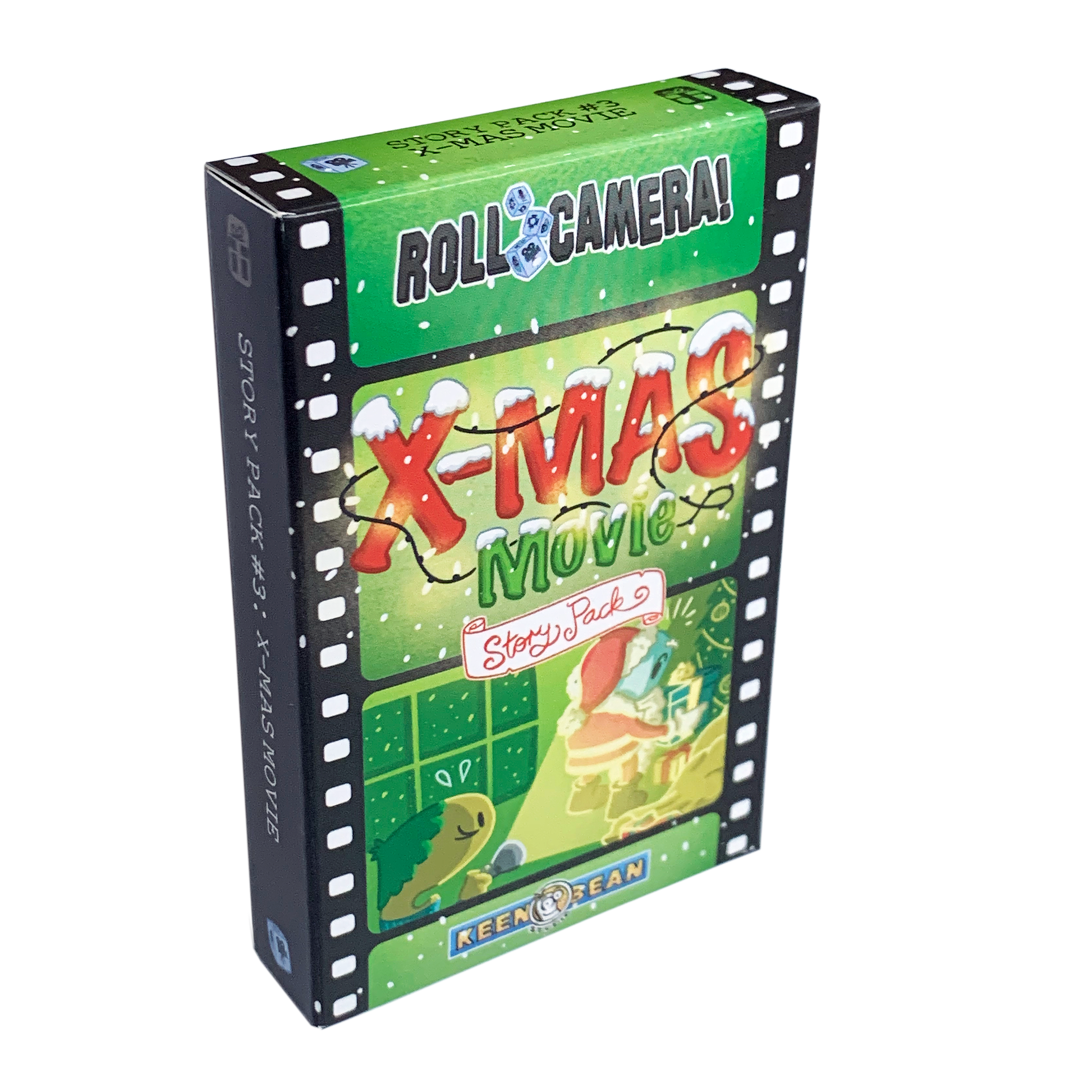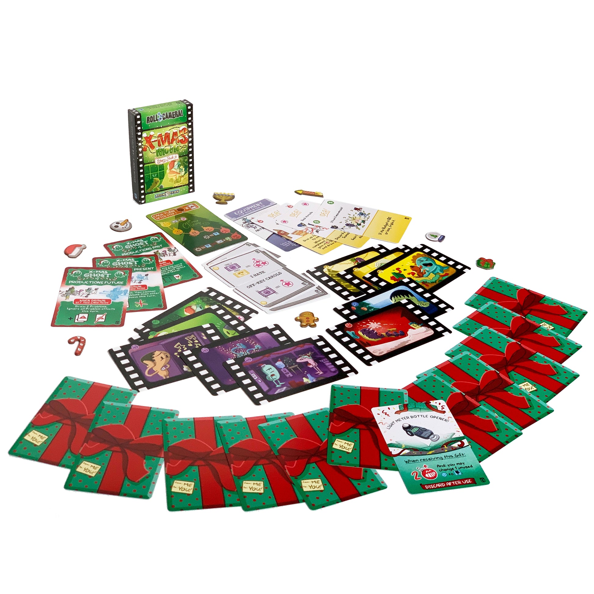 The X-mas Movie Story Pack includes 33 brand new cards (12 Gift cards, 10 holiday-themed Scene cards, 3 Idea cards, 1 Equipment card, 4 Script halves, and 3 new "X-mas Ghost" cards - a new twist on Problems with a Dickensian flair), as well as 8 holiday prop tokens and a Cheer Track for the new Crew Cheer mechanism.